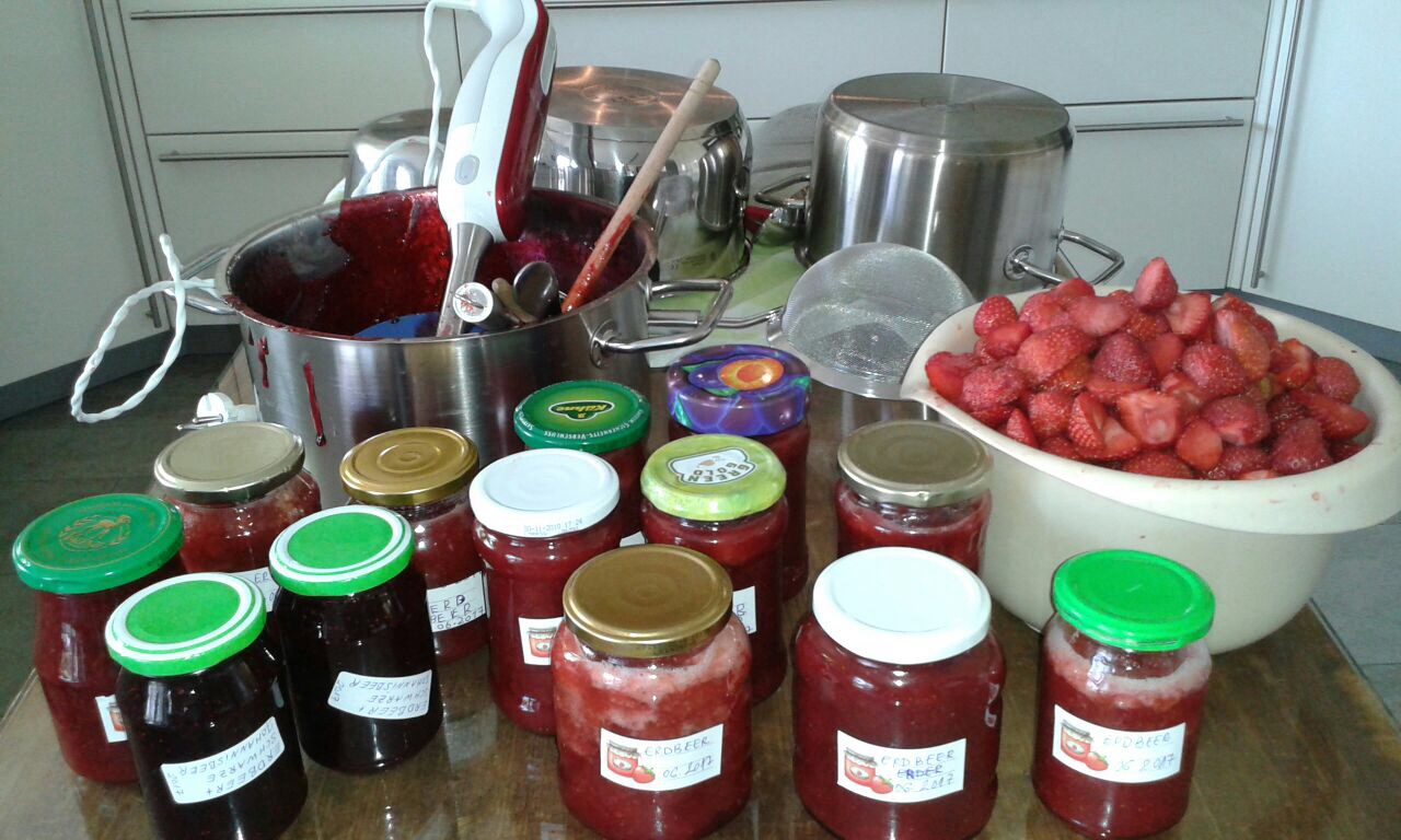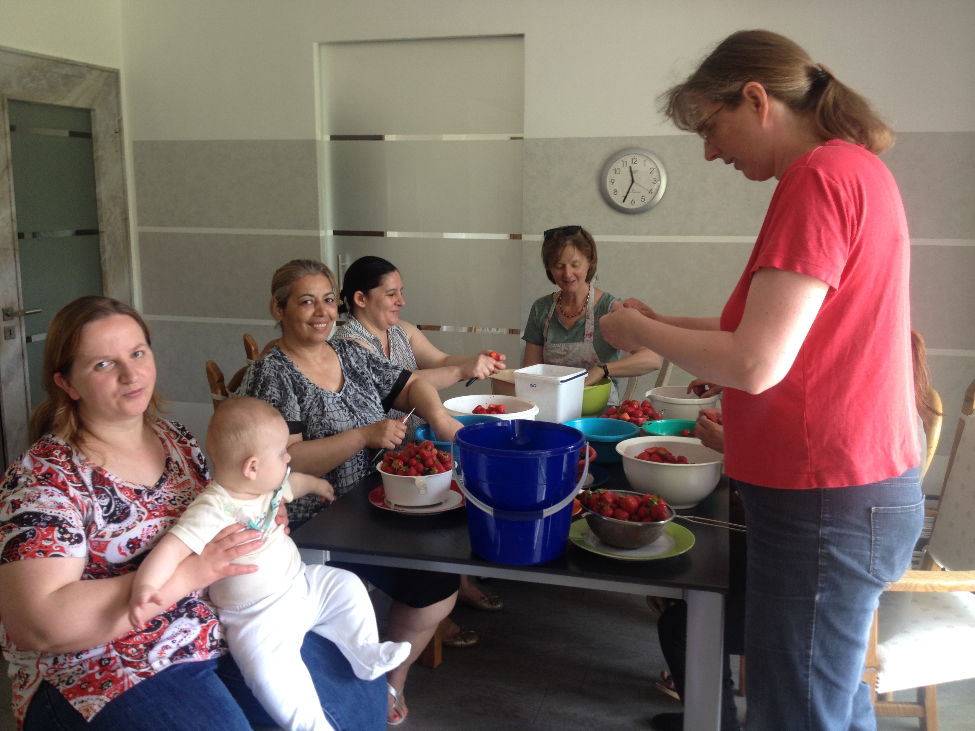 Ende Juni waren endlich die Erdbeeren reif, so dass auch das Marmeladekochen starten konnte. Gemeinsam ging es erst auf das benachbarte Erdbeerfeld, und dann stellte Ursula Brintrup (hinten im Bild) ihre Küche zur Marmeladenzubereitung zur Verfügung. Große und kleine Menschen verschiedenster Nationen waren dabei (hier im Bild: Albanerin, Serbin und Georgierin).