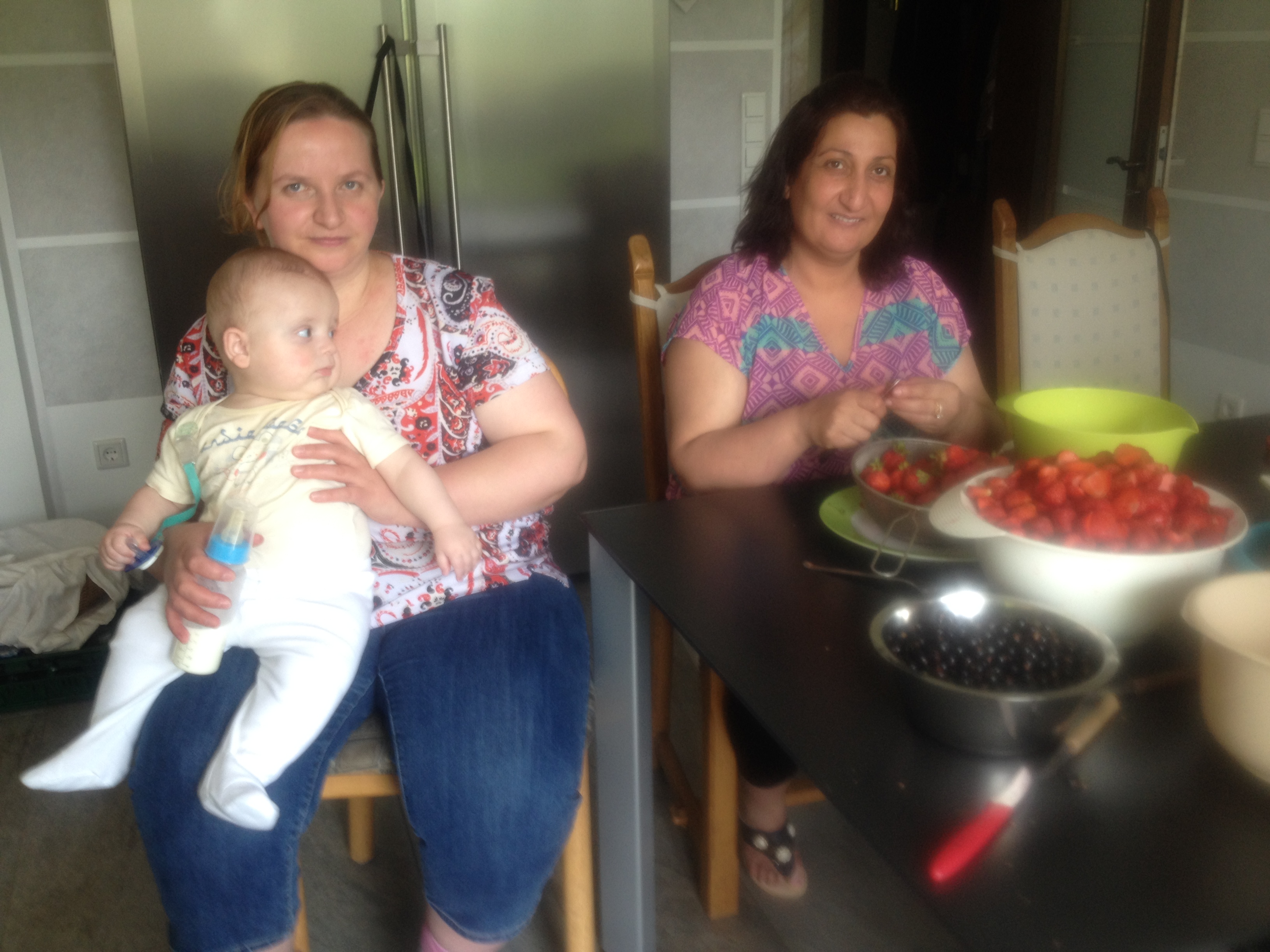 Mit insgesamt 10 Frauen haben wir in einer knappen Stunde 34 kg Erdbeeren gepflückt, wobei die ein oder andere Frucht bei den sommerlichen Temperaturen auch gerne gegessen wurde. Danach trafen wir uns, wie auch im letzten Jahr, bei Ursula Brintrup in der Küche, um aus den herrlichen Früchten Marmelade zu kochen. Die einen schnitten die Erdbeeren, die anderen spülten die Marmeladengläser durch und die dritte Gruppe fing an zu kochen. Ungefähr kamen 70 Gläser Marmelde dabei heraus, und jede fleißige Helferin nahm noch eine Tüte mit Erdbeeren für die Familen mit.